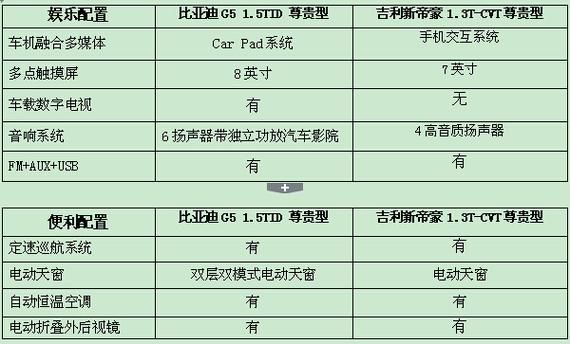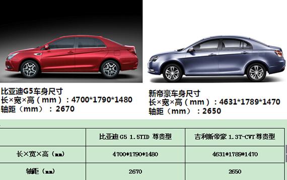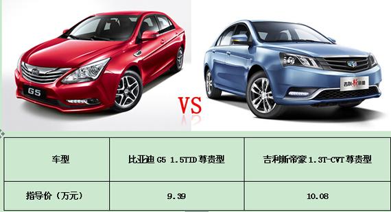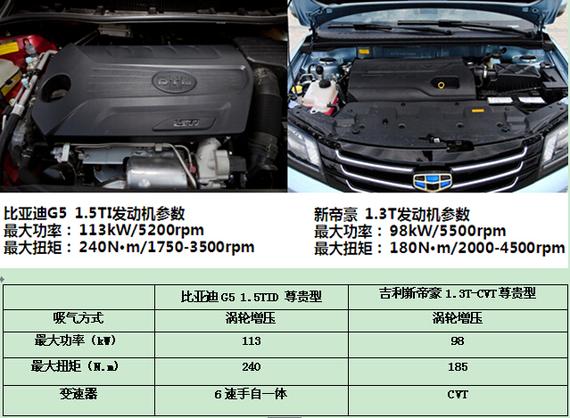 下面就让我们以比亚迪G5 1.5TID尊贵型与吉利新帝豪1.3T-CVT尊贵型来做个全面对比。