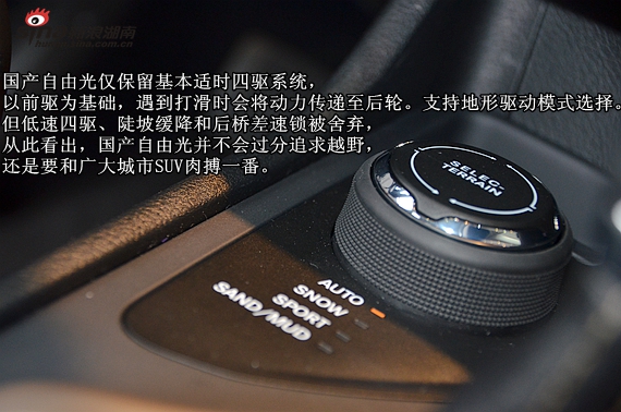 虽然定位于城市型的SUV,但国产自由光依然保持同级领先的全路况能力,Selec-Terrain路况自选系统提供四种驾驶模式:自动、泥/沙运动及雪地模式,驾驶者可通过旋钮即可实现模式转换。